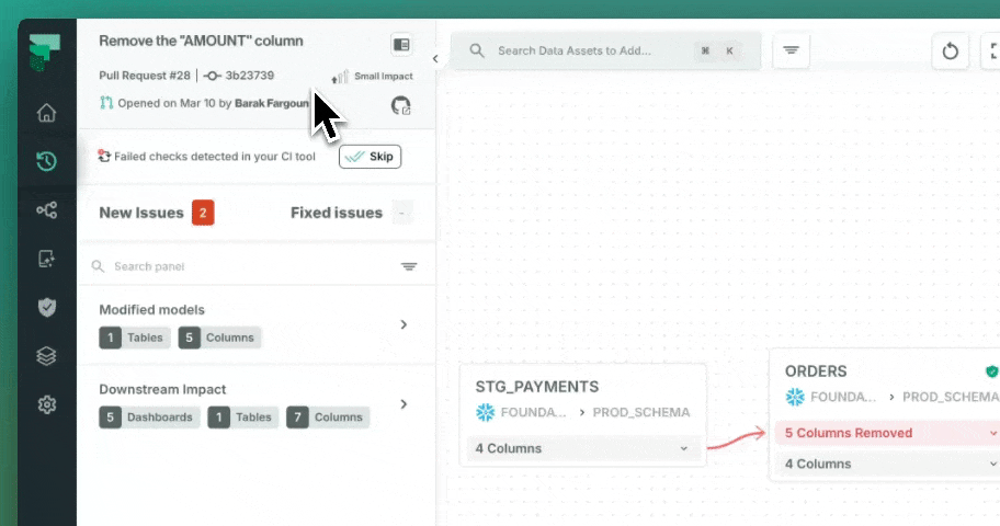 Because Foundational reads your application code, it knows exactly what will break when you change it. Every pull request is analyzed automatically across Java, Python, SQL, and Spark. Before a single line merges, your team sees which downstream models, dashboards, and pipelines are affected, with severity scoring and owner notifications built in. Application layer visibility is what makes this possible. Query log tools cannot tell you what an unmerged change will do because they have never seen the code that creates the data.