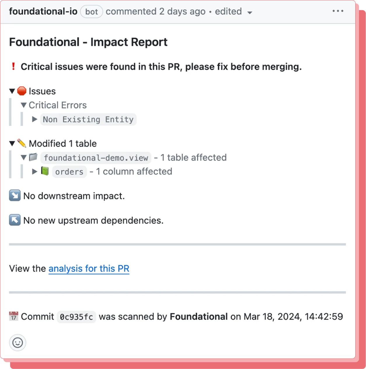 Every pull request that touches data is scanned within seconds. Reviewers see a clear summary of affected assets, owners, and risks so they can move faster with full context.